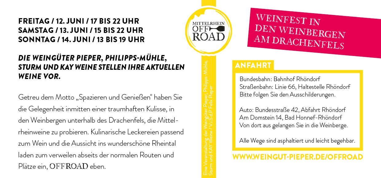 Kulinarische Leckereien passend zum Wein und die Aussicht ins wunderschöne Rheintal laden zum Verweilen abseits der normalen Routen und Plätze ein: OFFROAD eben.